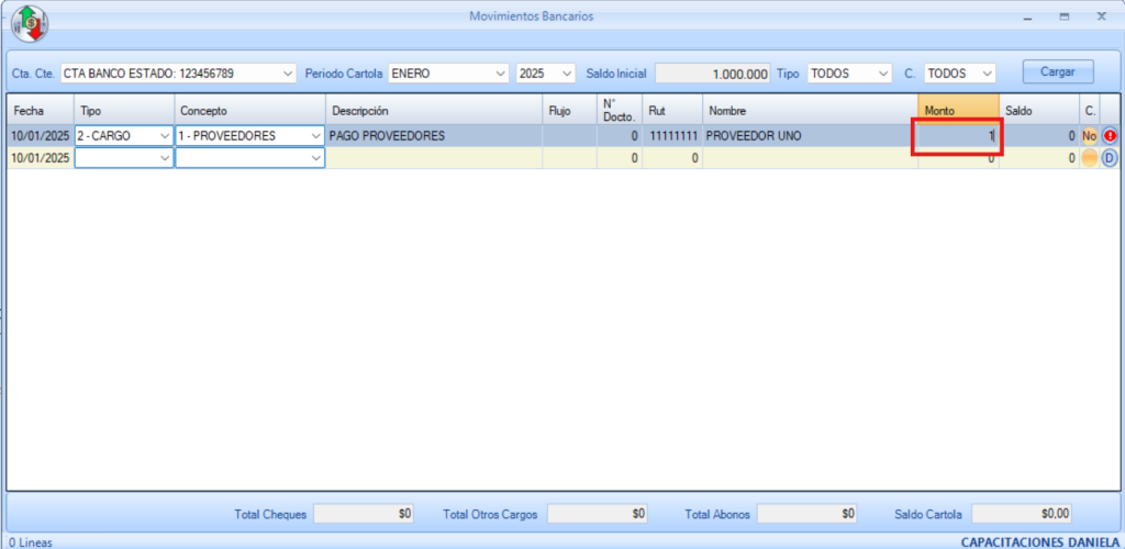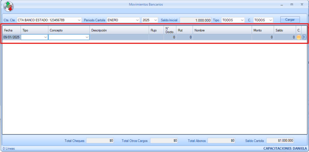 - Saldo Inicial: corresponde al saldo inicial de cartola bancaria del periodo.