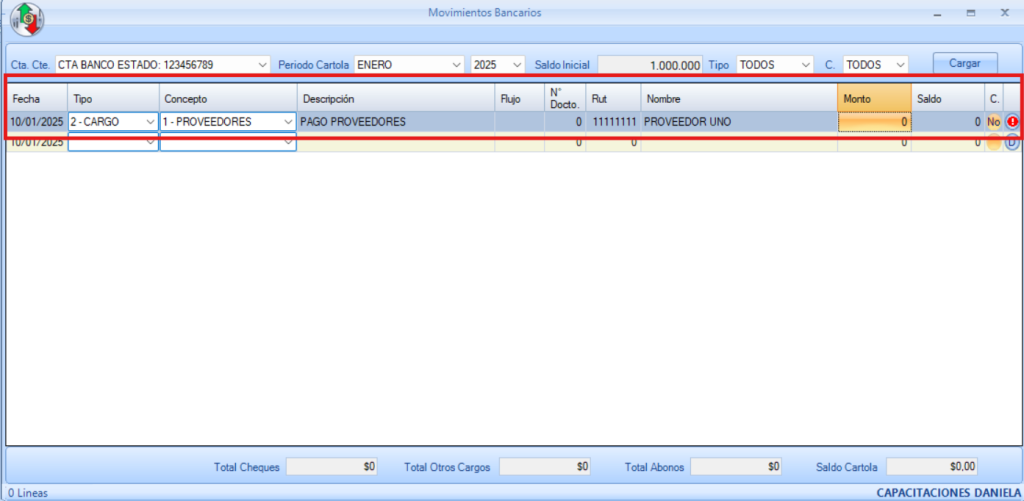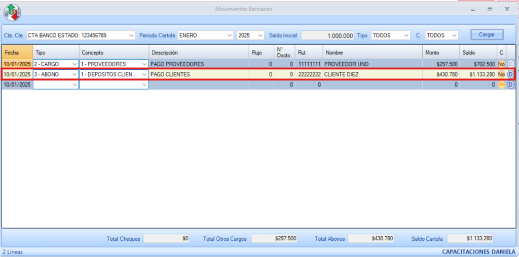 - Tipo: debe indicar si el movimiento está asociado a cheques, es un cargo o un abono.