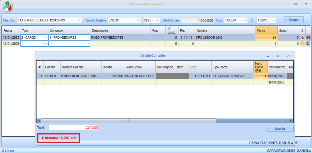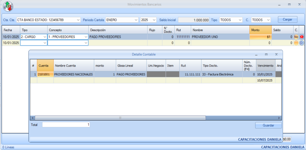 Al elegir la factura, aparecerá un saldo descuadrado, dado que se ingresó un 1 peso de monto.