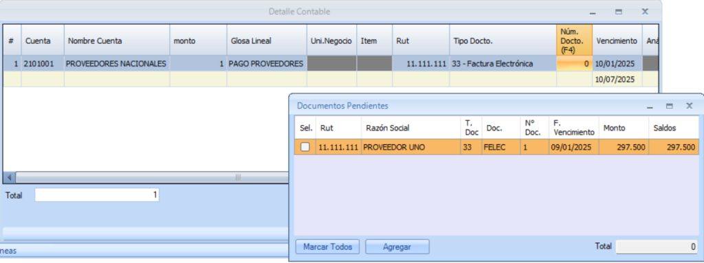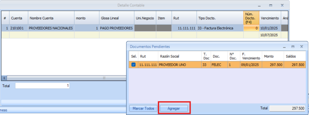 En DETALLE CONTABLE, en NÚM. DOCTO. debe seleccionar con F4 o CTRL + F4 los documentos que se encuentran pendientes de pago.