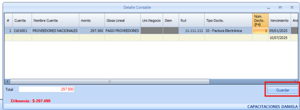 Una vez presione ENTER, aparecerá la ventana de DETALLE CONTABLE, que mostrará la manera en que generará la contabilización del pago.