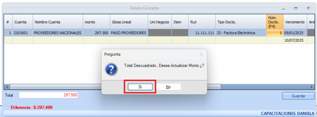 Sin embargo, al presionar el botón Guardar, aparecerá la ventana de Pregunta, en la que se consultará si desea actualizar el monto debido al descuadre.
