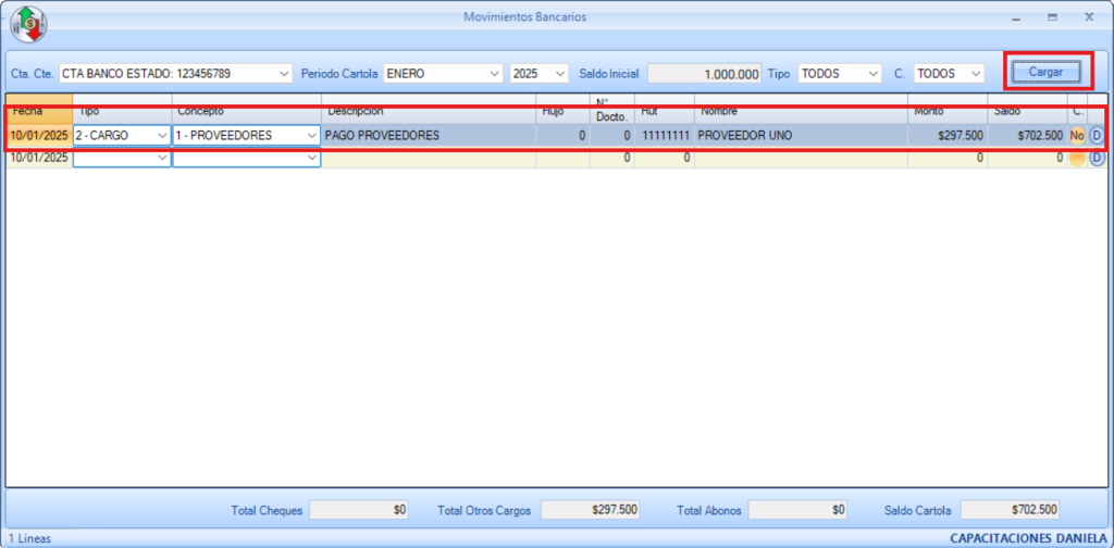 - Cargos: hace referencia a los movimientos bancarios asociados a los egresos o salidas de dinero de la empresa.