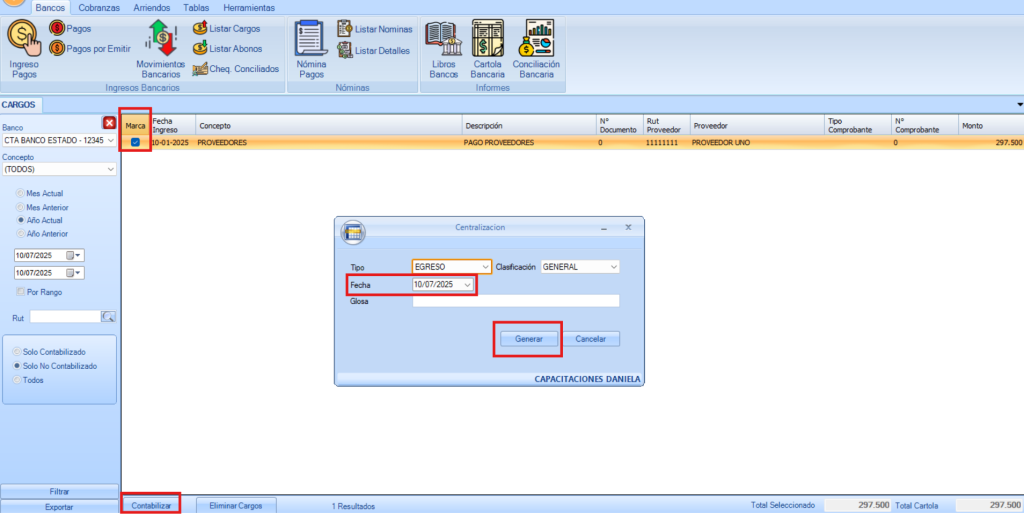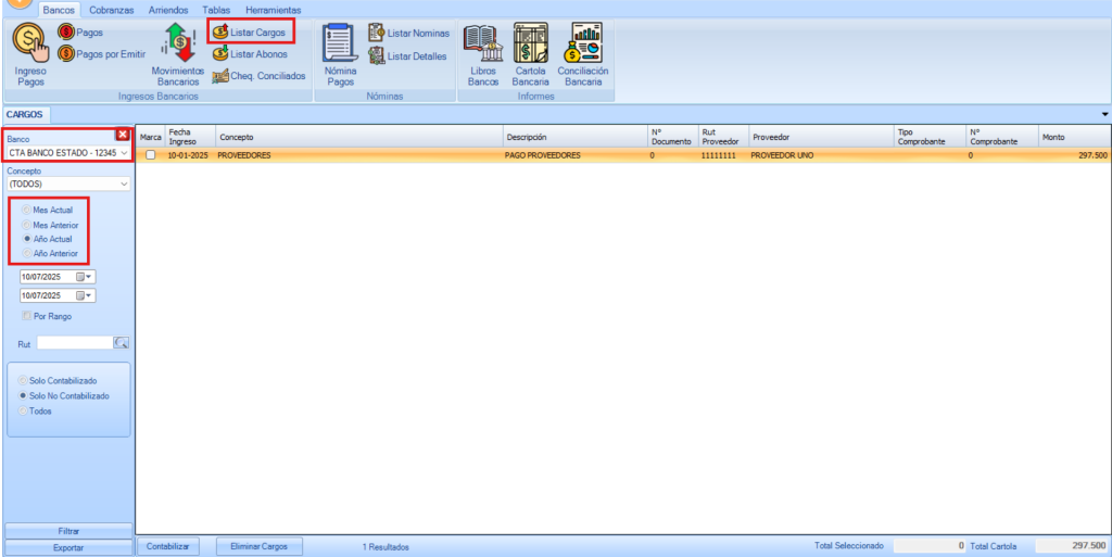 Para centralizar este documento, presione el icono Listar Cargos, seleccione el banco, el periodo de tiempo a centralizar y el estado Solo No Contabilizado.