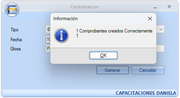 Tal y como en los cargos, seleccione fecha, ingrese la glosa y Genere, aceptando el folio del comprobante.
