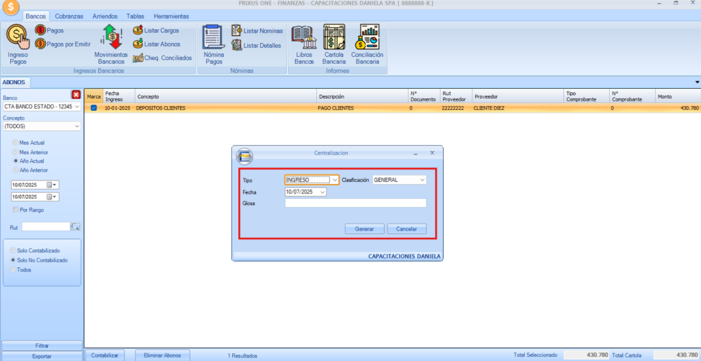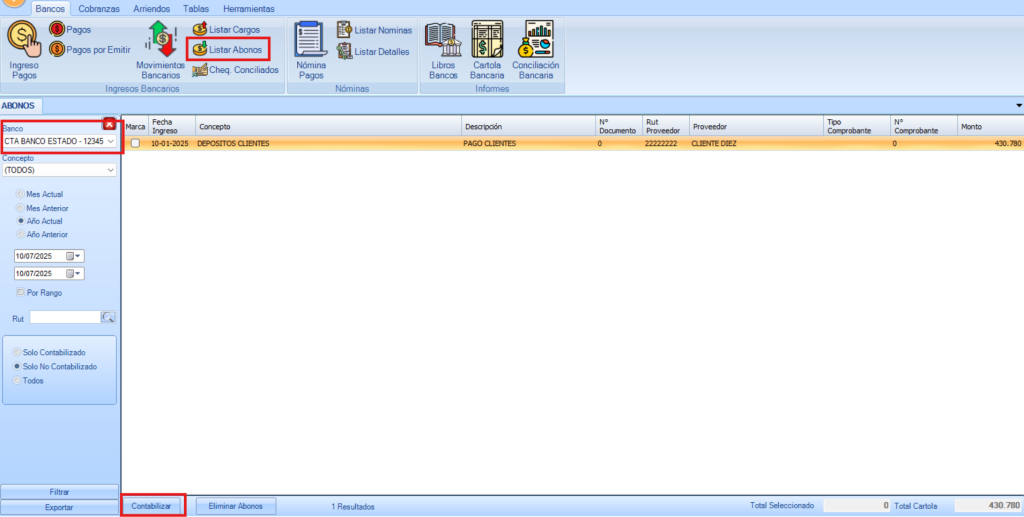 Y para centralizar el movimiento, debe presionar el icono Listar Abonos, seleccionar el banco, el periodo de tiempo, el estado Solo no Contabilizado, y el botón Contabilizar que se encuentra en la parte inferior.