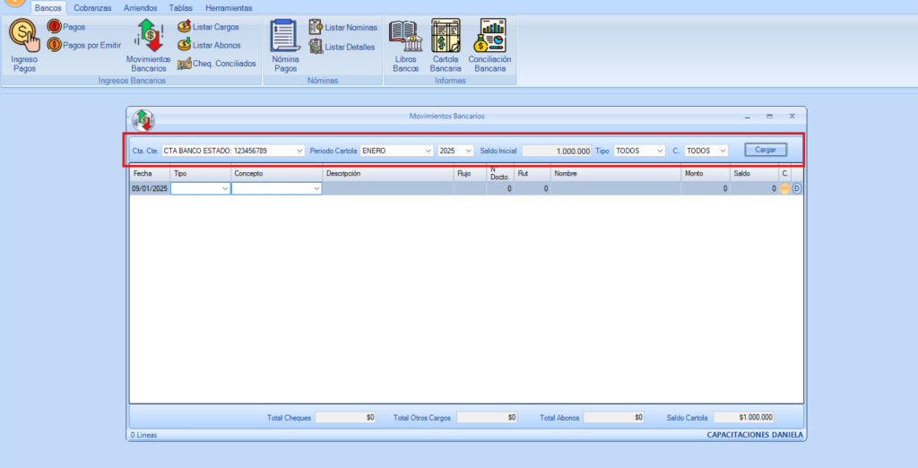 En el módulo de Finanzas, en la ventana de Banco, icono Movimientos Bancarios, se puede ingresar los datos de la Cartola Bancaria.