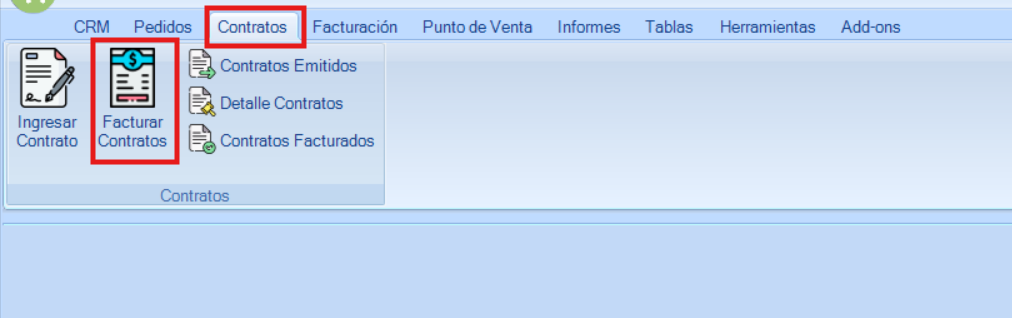 Para generar la emisión de facturas másivas, en el módulo de Ventas, la ventana de Contrato, seleccione el icono FACTURAR CONTRATOS.