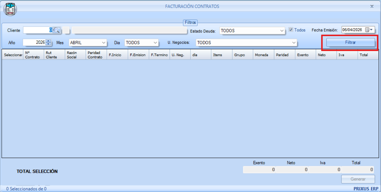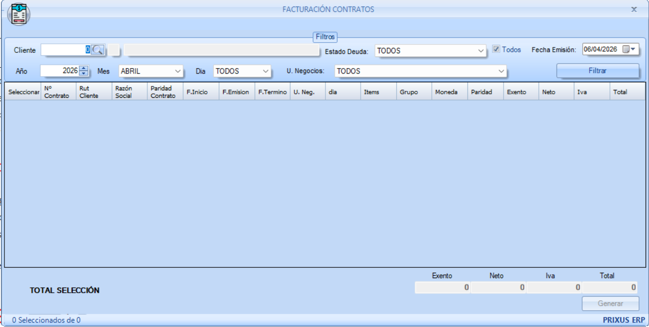 Aquí aparecerán las facturas generadas desde los contratos, aún pendientes de emisión definitiva. Allí, se podrá también seleccionar los documentos a facturar según la grilla que se encuentra al costado.