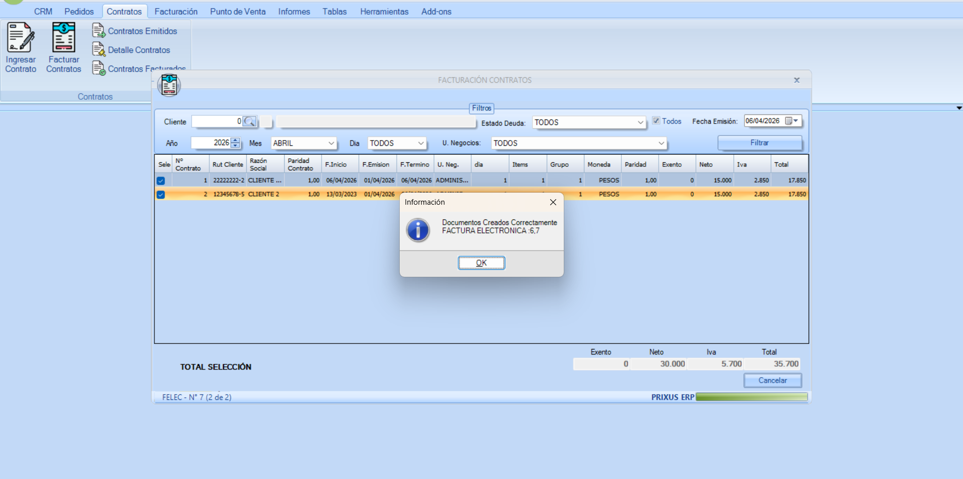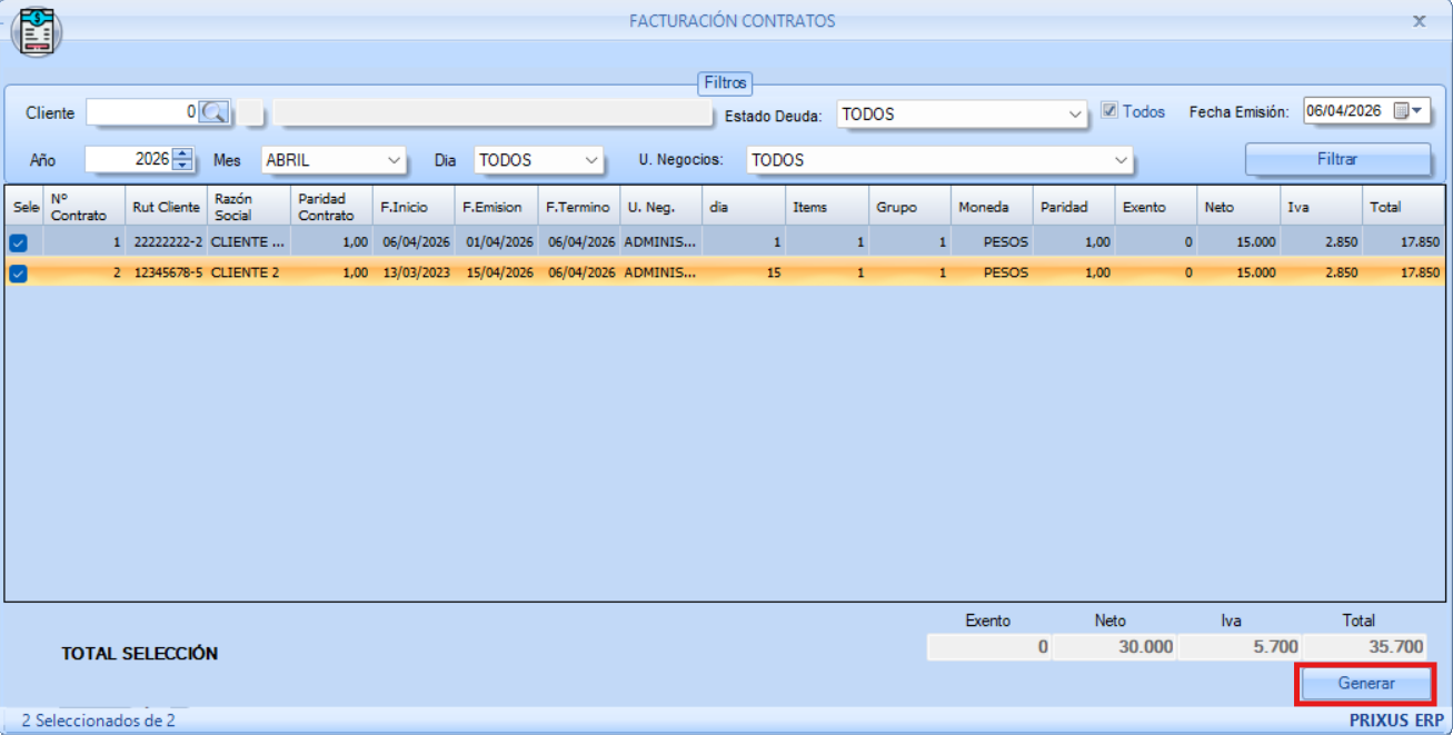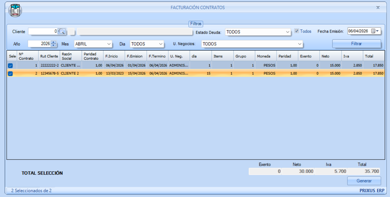 - En el ejemplo, se seleccionan dos contratos para emitir al día siguiente.