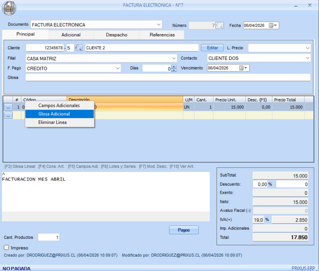 Aparecerá la ventana de Facturación, donde deberá indicar los siguientes datos: