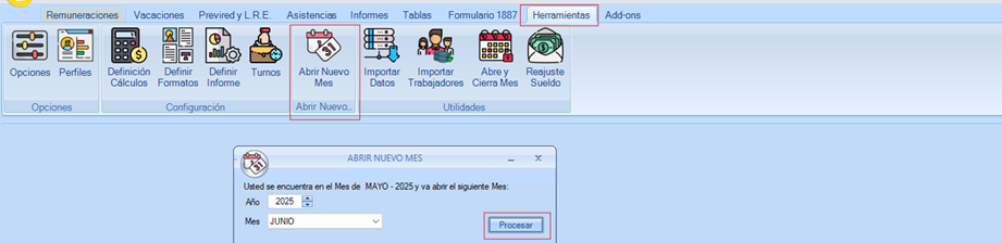 Si desea comenzar a trabajar en un mes diferente al que trae el sistema debe realizar el cambio de mes desde la pestaña Herramientas en el icono abrir nuevo mes, desde allí debe procesar mes a mes hasta llegar al mes en el que quiere comenzar a trabajar: