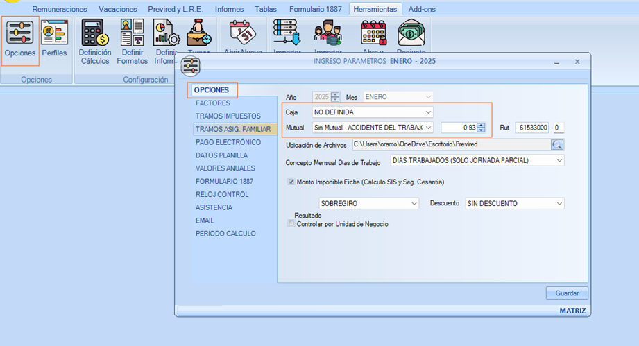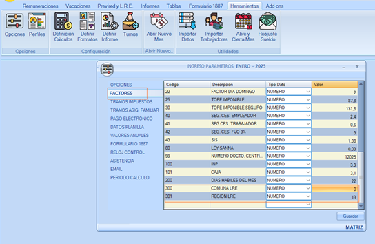 Luego en Factores: Ingrese el código de para la comuna y región del libro de la DT.
