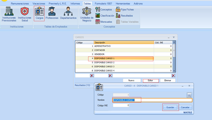 Ingrese en el icono “Cargos”, click sobre los disponibles, edite la descripción y guarde: