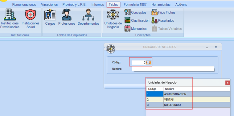 Desde la pestaña Tablas, ingrese en el icono Unidades de Negocio: con la lupa verifique los códigos creados y descripciones, cierre en la X esa información; luego ingrese en el código y descripción sobre los campos correspondientes, cree el que usted requiera con el código que usted desee colocarle, luego guarde desde el icono en la parte superior izquierda de la ventana.