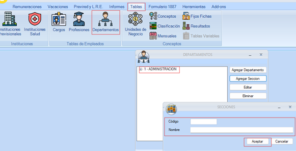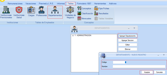 Presione el botón Agregar Departamento y coloque el código y nombre correspondiente y presione aceptar: