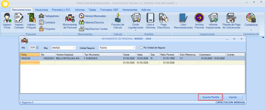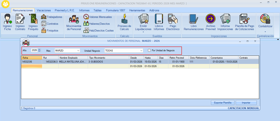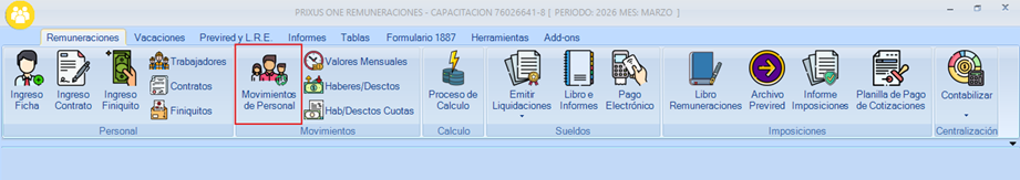 Para utilizar el importador de movimiento de personal debe dirigirse a la pestaña de Remuneraciones en el icono “Movimiento de Personal”.
