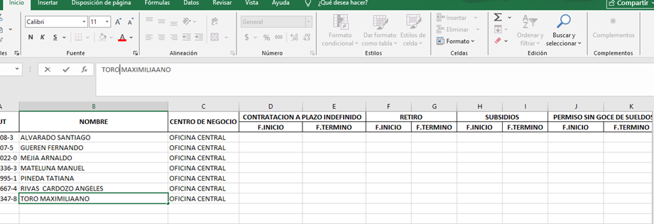 Se abrirá el archivo Excel mostrando los trabajadores activos de la unidad de negocio seleccionada, junto con las columnas correspondientes a los movimientos de personal (dos columnas por movimiento) donde usted debe colocar las fechas “Inicio y Termino” de los eventos: