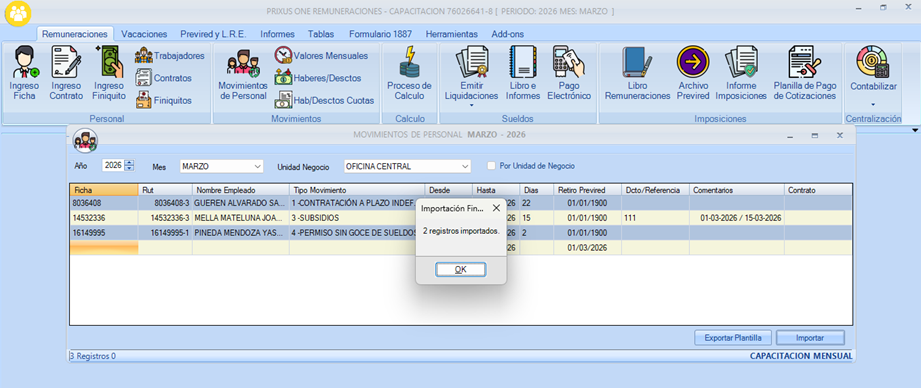 Al presionar, aparecerá la ventana informativa que indicará la cantidad de registros importados.